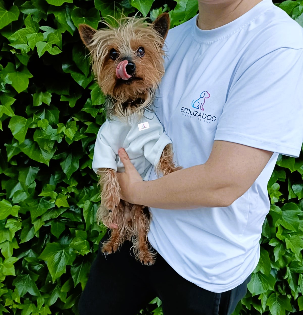 Camiseta para perro con la leyenda «Mi felicidad está donde empieza la correa».